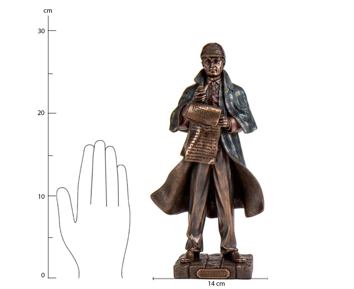 Статуэтка Veronese "Шерлок Холмс" изображает легендарного детектива, созданного Артуром Конан Дойлем, который решает сложные криминальные загадки и дела. Шерлок Холмс славится своей умственной изощренностью, логическим мышлением и способностью раскрывать преступления. Статуэтка Шерлока Холмса может быть интересным подарком для работников правоохранительных органов, любителей детективов и ценителей творчества Конана Дойля. Статуэтка изготовлена из полистоуна (искусственного камня) и покрыта бронзовым напылением. Упакована в красивую подарочную коробку. Поэтому покупая эту статуэтку, Вы получаете ценный и красивый подарок, который не требует дополнения. Благодаря надежной внутренней упаковке, изготовленной из пенопласта с углублениями для самых маленьких деталей, Вы можете быть уверенными в безопасности при транспортировке. Высота статуэтки - 28 см, ширина - 14 см, длина - 8 см. VERONESE