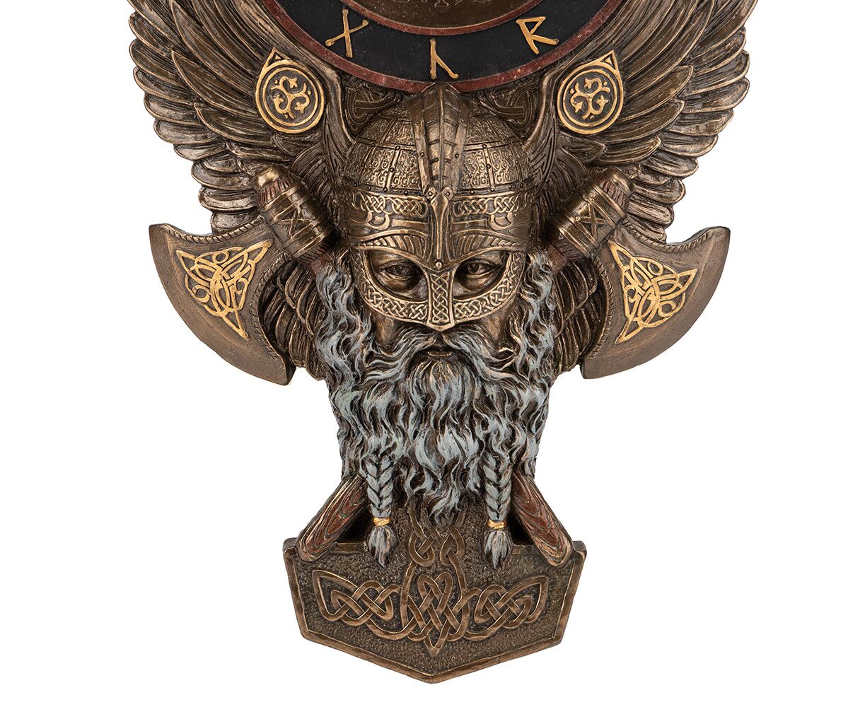 Высота часов - 29, длина - 19, ширина - 4 см. Настенные часы Veronese изготовлены из высококачественного полистоуна - искусственного камня, позволяющего передать мельчайшие детали образа. Аксессуар надежно упакован в подарочную коробку, а внутренняя пенопластовая форма с индивидуальными углублениями гарантирует полную безопасность при транспортировке. Часы «Бог Один» олицетворяют образ мудрого и могущественного бога, покровителя воинов и магии. Фигура Одина изображена в крылатом шлеме, со зрелым лицом и длинной бородой, а над ним расположен циферблат с древними скандинавскими рунами, символизирующими защиту, силу и знания. Изысканная проработка крыльев, доспехов и декоративных элементов подчеркивает величие и символизм этого скандинавского божества. Такие часы станут не только стильным акцентом интерьера, но и мощным оберегом, наполняющим простор атмосферой мудрости, силы и древних традиций Севера. VERONESE